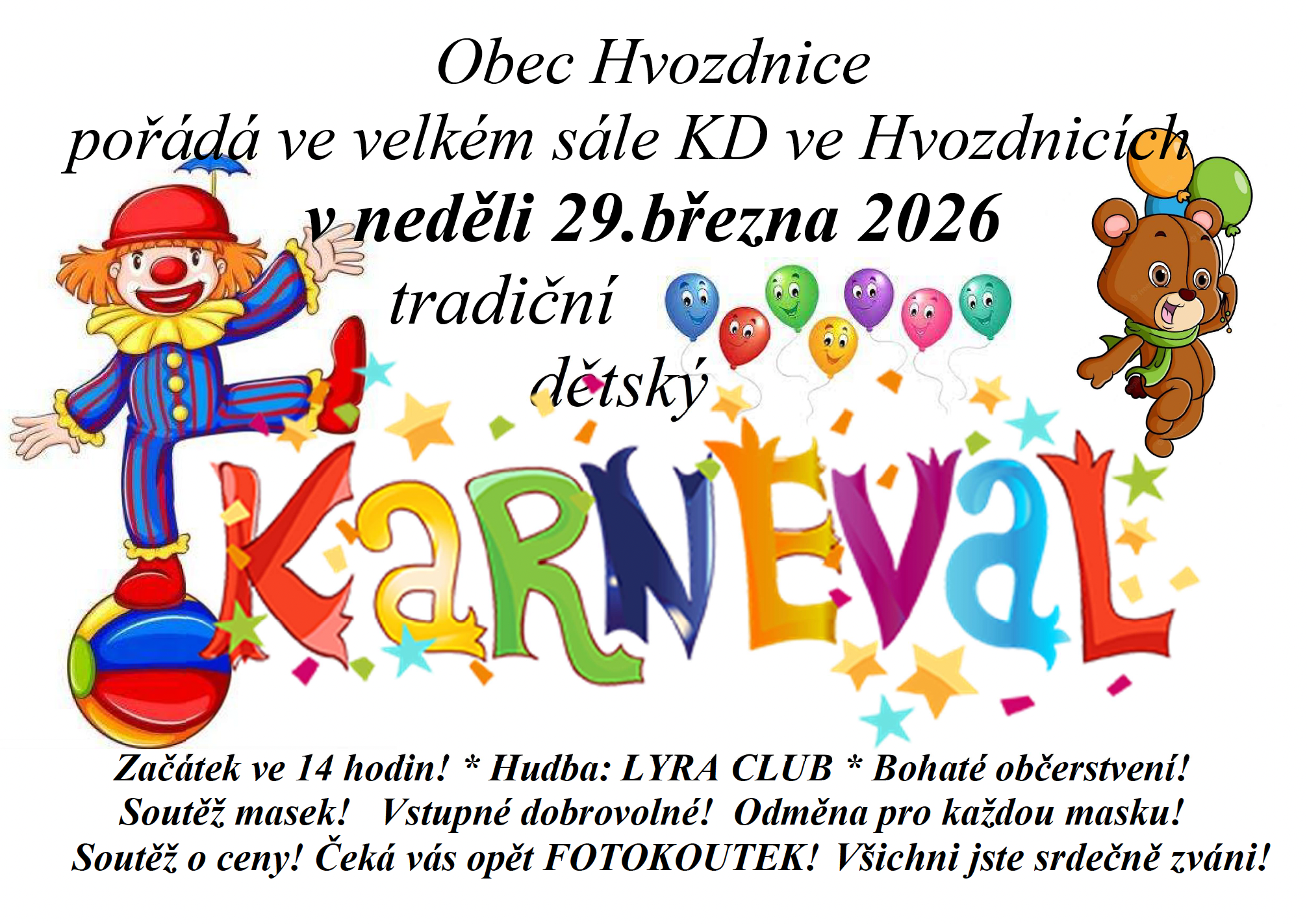 Dětský karneval ve Hvozdnicích 11. 3. 2026 autor: Jana ŠtěpánkováV neděli 29.3.2026 se koná od 14 hodin tradiční dětský karnevalPřílohyKarneval (3 MB)